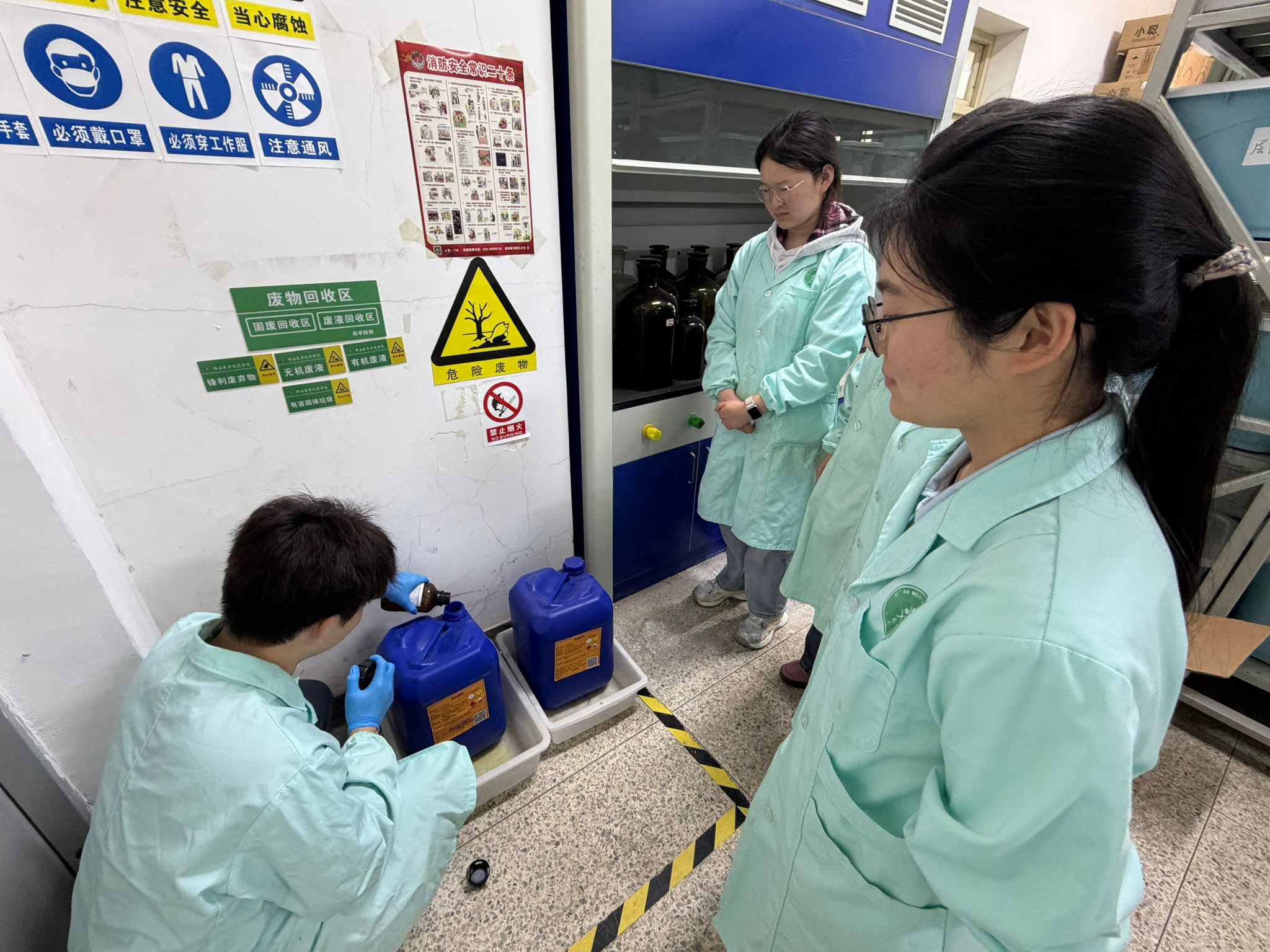 3.强化危险废液规范处置培训。针对实验过程中产生的成分复杂、毒性高、腐蚀性强的废液,中心明确要求学生严禁随意倒入下水道,详细讲解了危险废液的分类收集、规范存放方法,并明确告知学生需按照学校规定时间,将收集好的危险废液统一送至废液暂存间,确保废液处置安全、合规、环保。