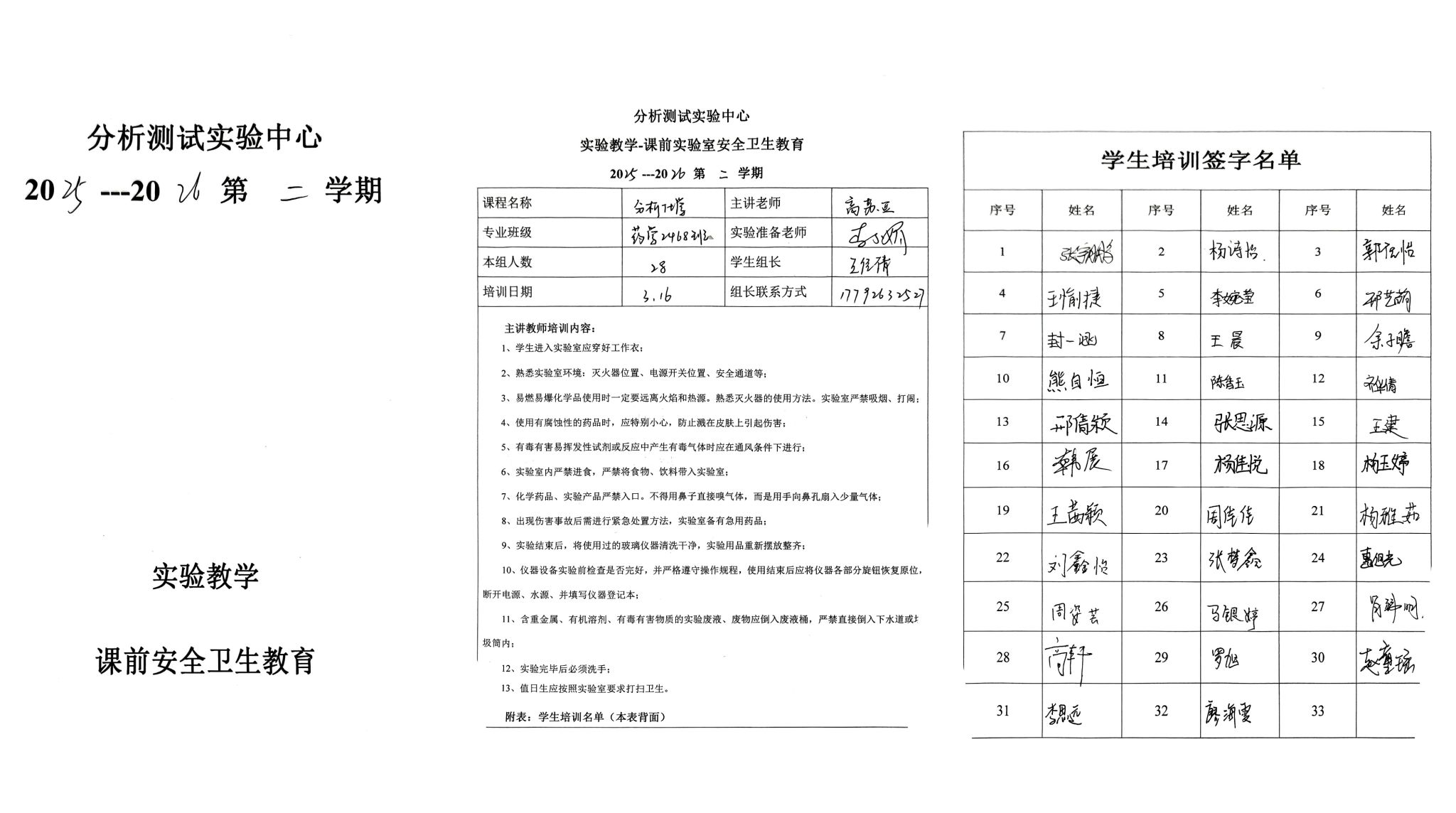 1. 强化课前安全宣讲,铸牢前置防线。分析测试实验中心严格落实课前安全教育制度,每位代课教师在实验课程开始前,都会对学生进行针对性的实验室安全知识讲解,重点强调实验操作规范、安全注意事项及应急处置要点,并详细做好相关记录,确保学生带着安全意识开展实验操作。